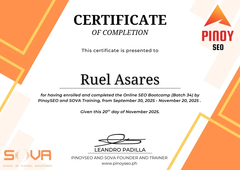 Taking the SEO Online Bootcamp at Pinoy SEO and SOVA has been one of the most valuable learning experiences in my digital marketing journey. The program provided a solid, hands-on foundation in all major areas of SEO—from understanding search engine behavior to applying real optimization techniques that make websites rank, convert, and grow.
